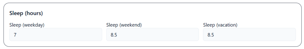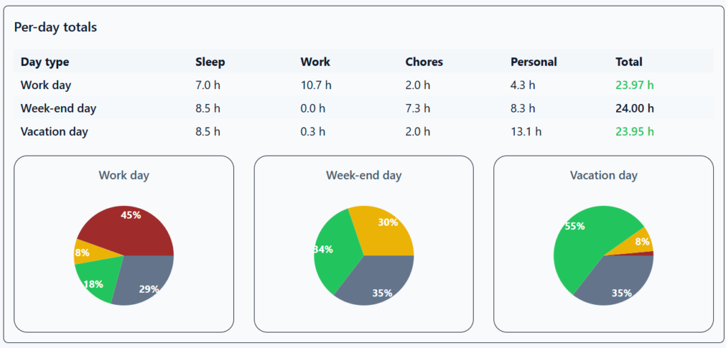 On an average workday, I spent about 7 hours on sleep-related activities—including preparation for sleep, trying to fall asleep, and actual sleep. I compensated slightly during weekends and vacations.