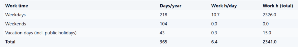 | NICE JOB: 17y x 2,034h/year = 34,578h | BAD JOB: 14y x 2,341h/year = 32,774h |