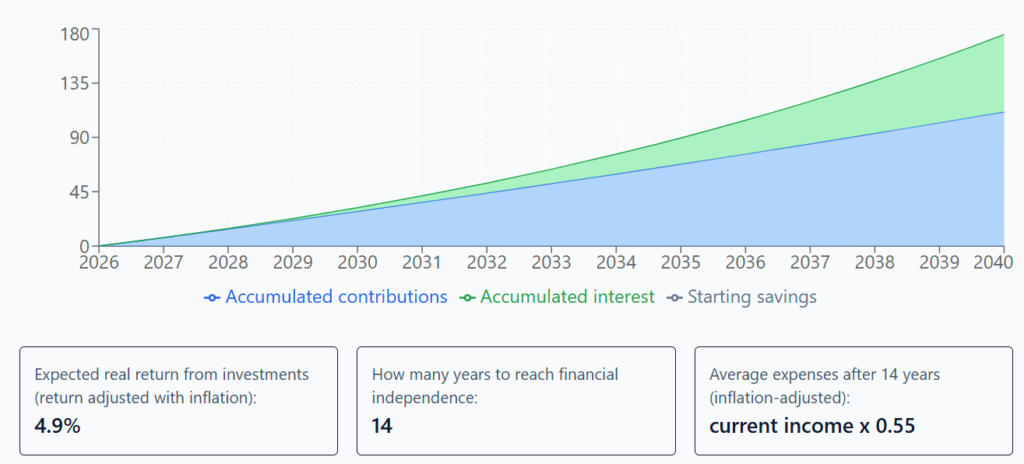 That’s slightly misleading. Here’s the reason: my calculator applies the entered yearly conditions uniformly across the entire lifespan, not just the remaining years. When you isolate only the remaining working years, the numbers are clearer: